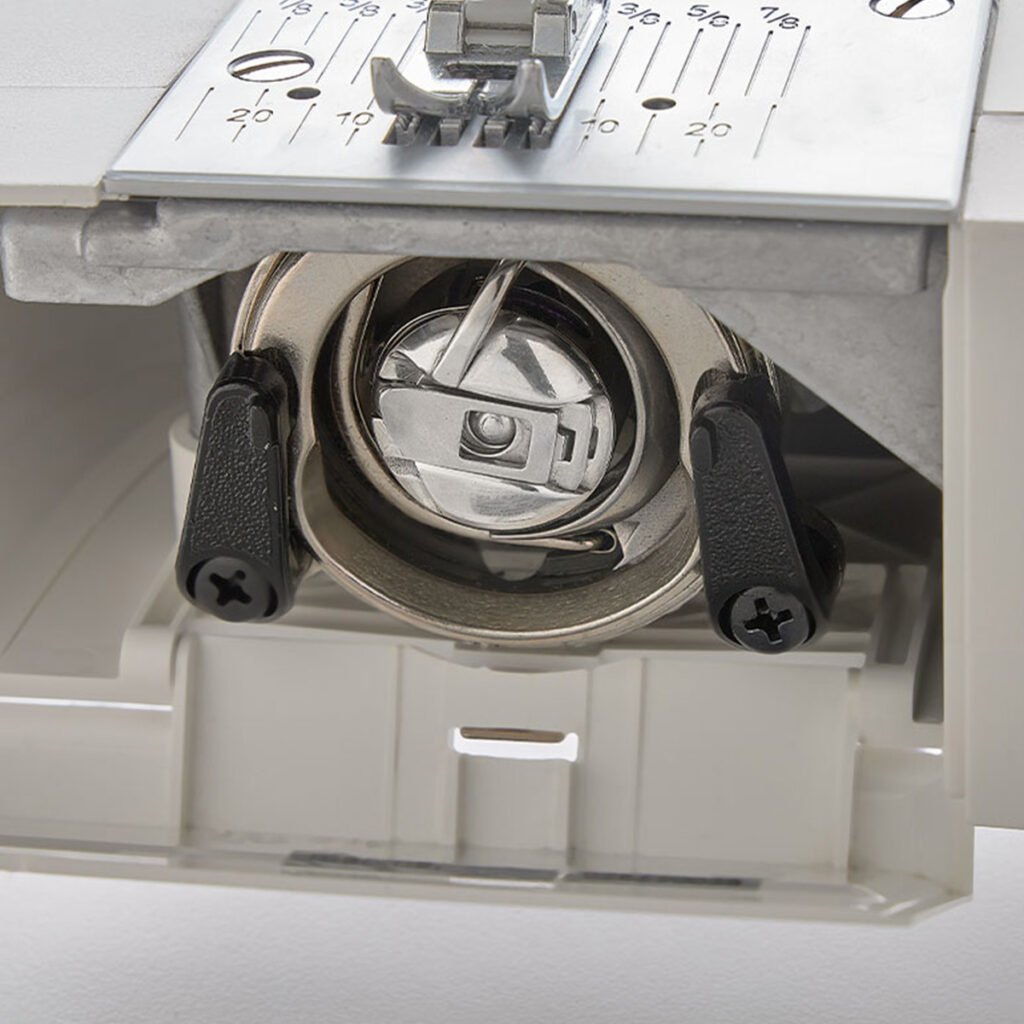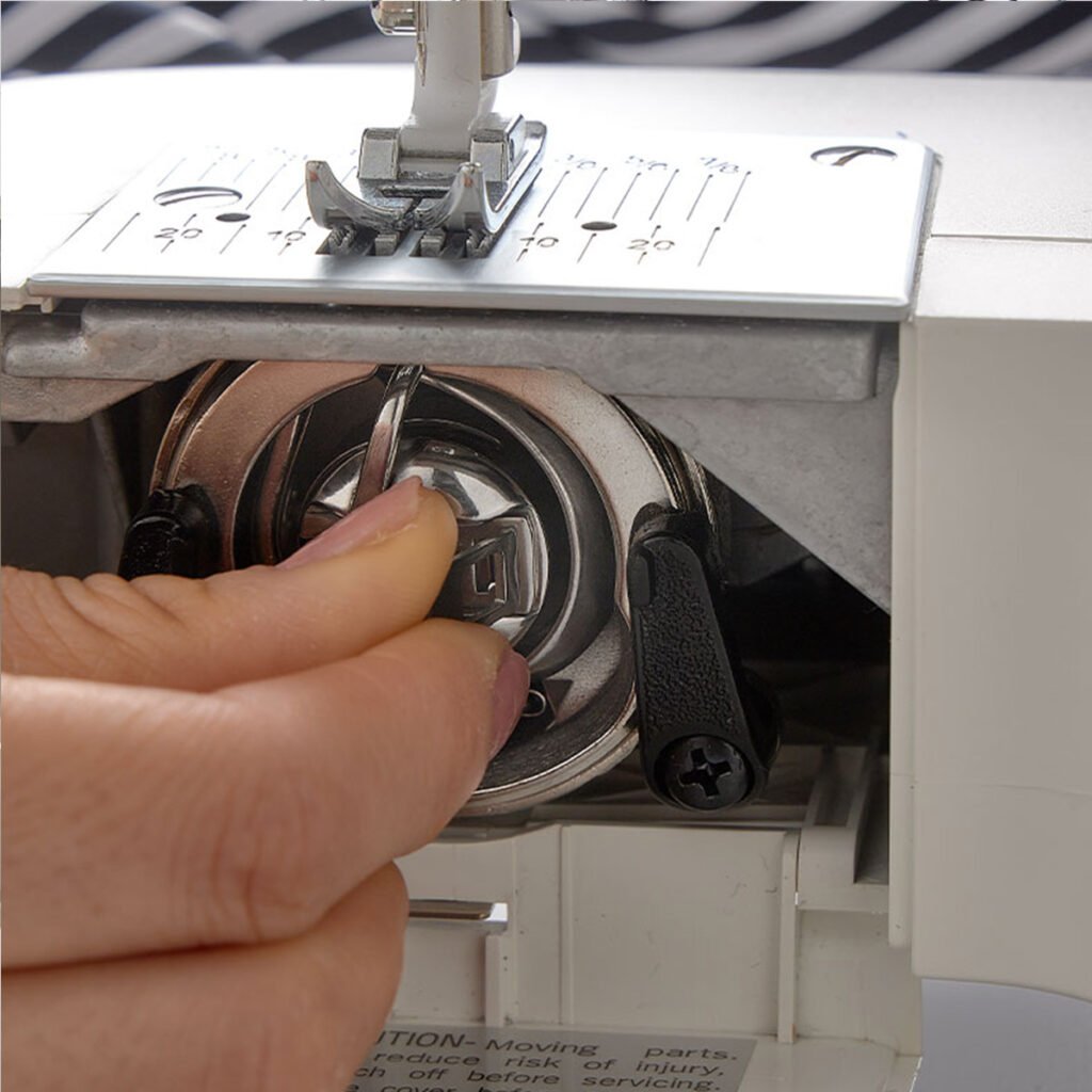Cose fácilmente con hilos más gruesos ajustando el tornillo de tensión en la caja bobina. Perfecta como caja bobina de repuesto.