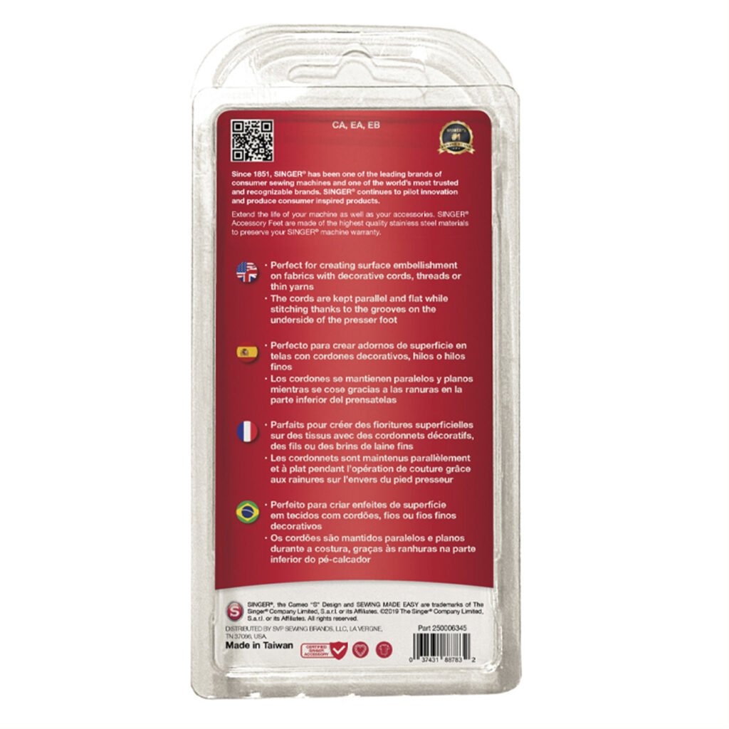 Los cordones se mantienen paralelos y planos mientras se cose gracias a las ranuras en la parte inferior del prensatelas.