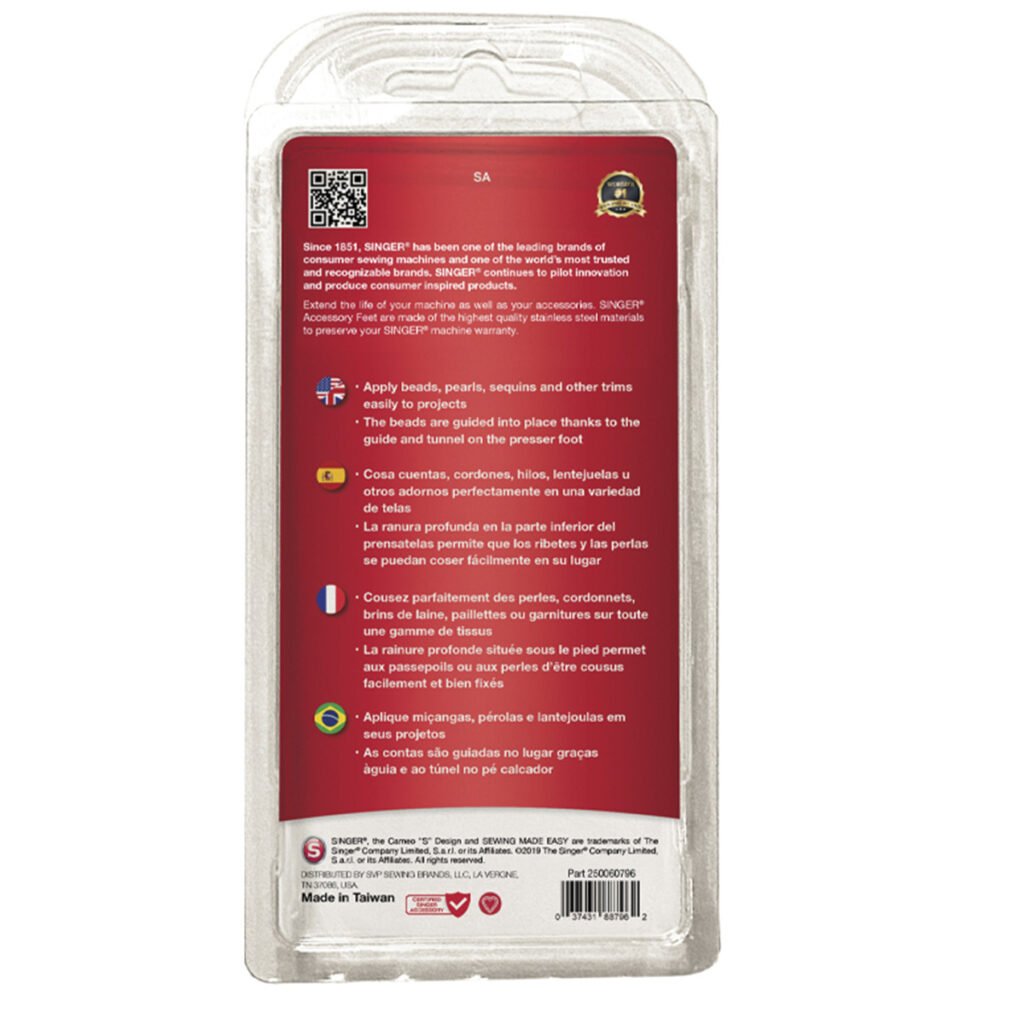 La ranura profunda en la parte inferior del prensatelas permite que los ribetes y las perlas se puedan coser fácilmente en su lugar.