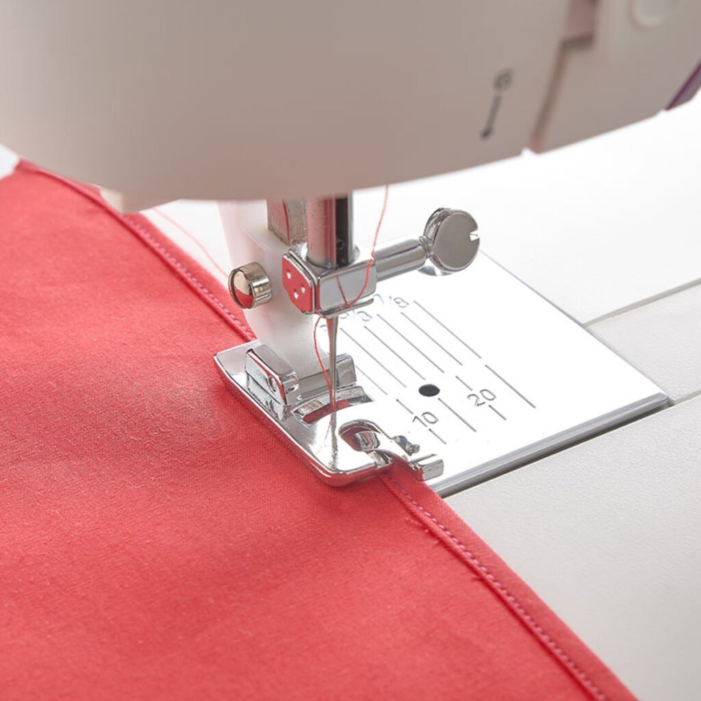 La ranura estrecha enfrente del prensatelas te permite acomodar fácilmente la tela para crear hermosos adornos. Utiliza una punta recta o Zig-zag para un terminado perfecto.