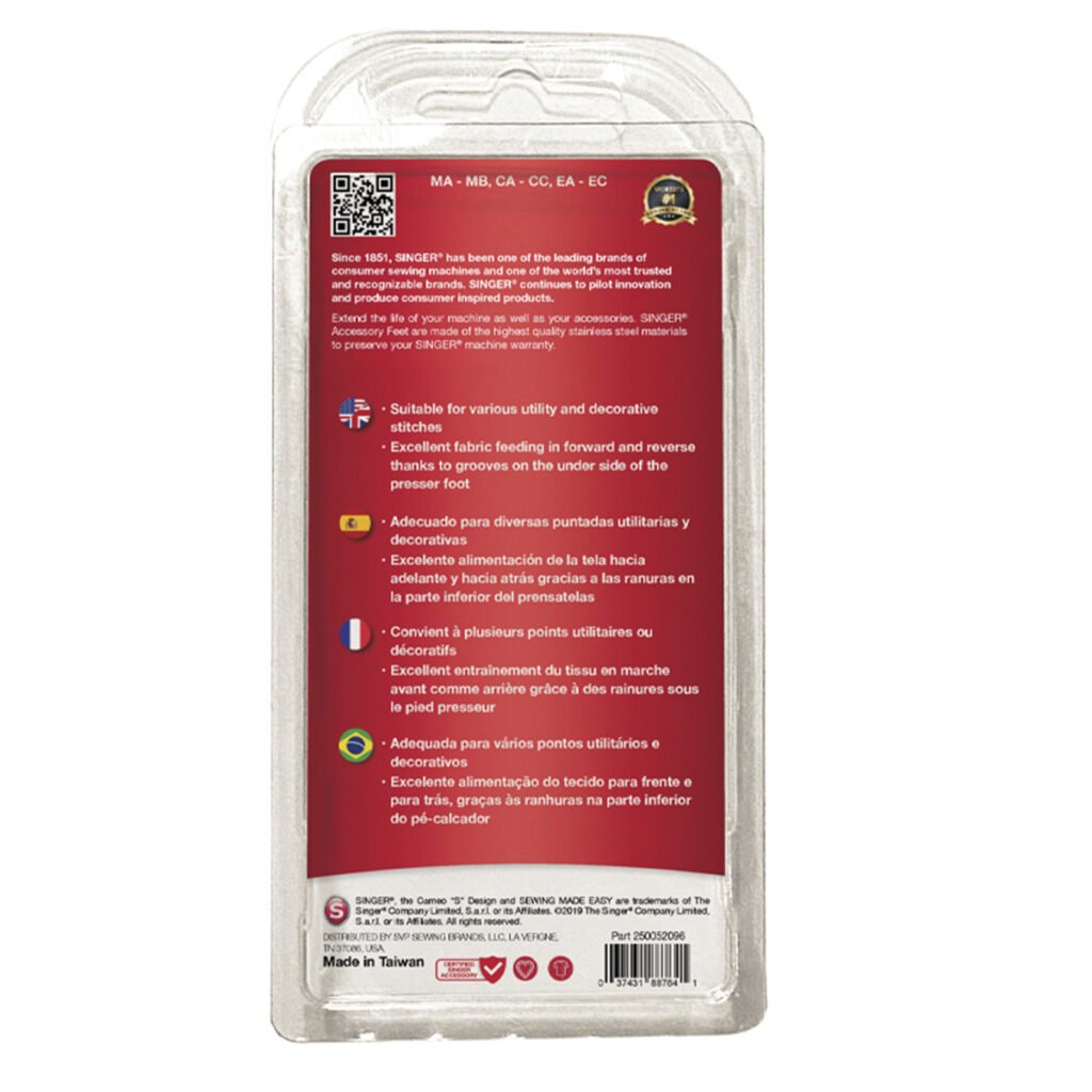 Excelente alimentación de la tela hacia adelante y hacia atrás gracias a las ranuras en la parte inferior del prensatelas.
