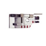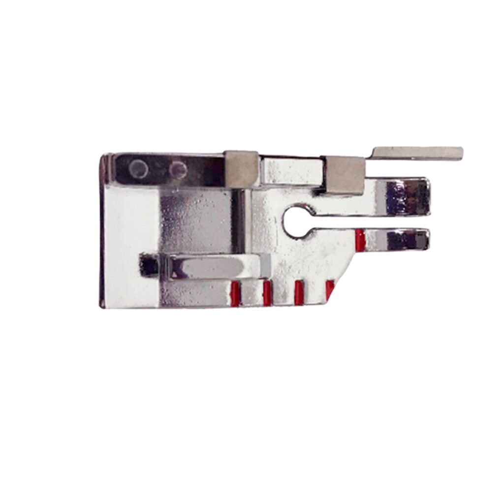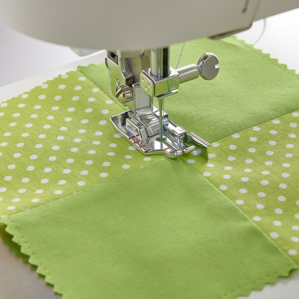 Comienza y termina tu costura a 1/4″ alineando el borde de la tela con la guía de metal en el costado del prensatelas. Facilita tu costura gracias a las guías en color rojo marcadas en el prensatelas. Ideal para técnicas de Patchwork